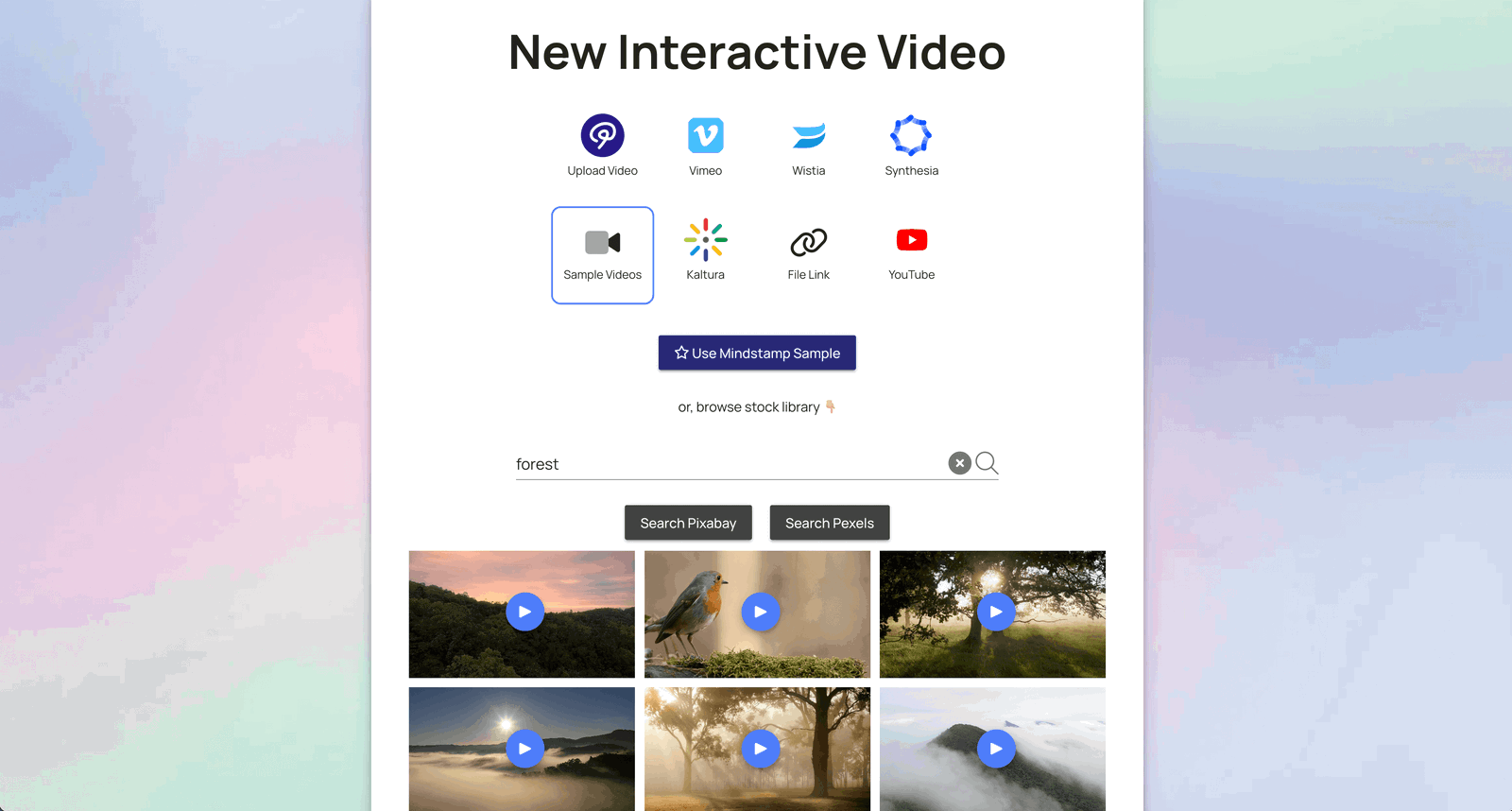 Of course Mindstamp also gives you a library of videos to start with from stock libraries from both Pixabay and Pexels. When creating a new interactive video just click ‘Sample Videos’, decide what you want to search for and click one of the two resources to find a number of great resources.