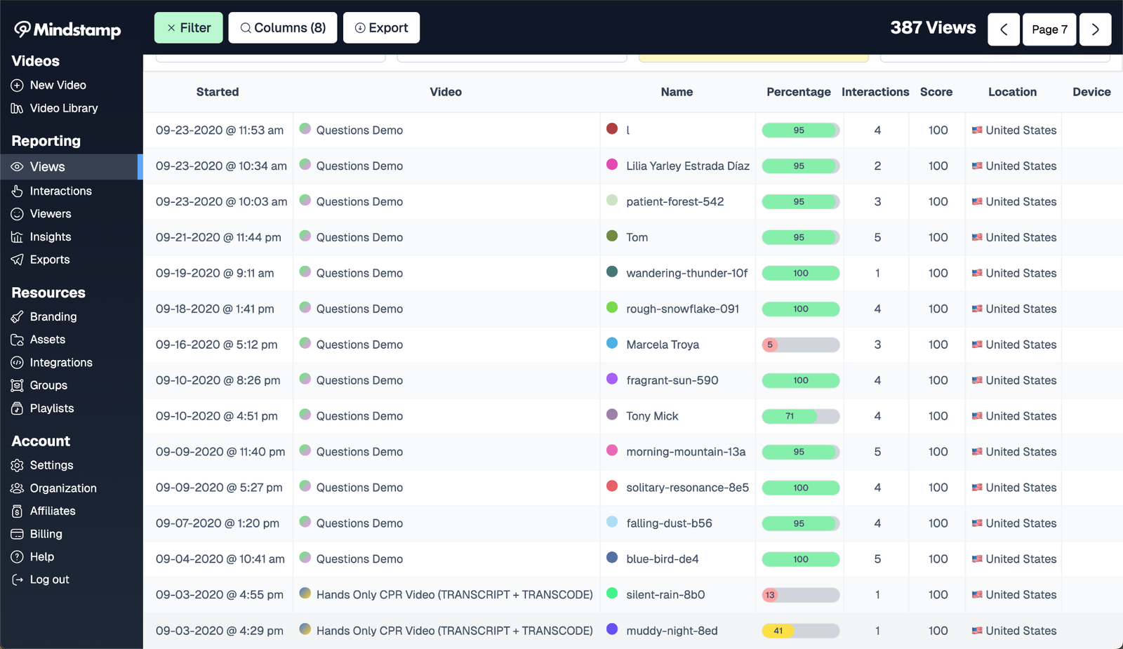 Once you share your video, you'll get uniquely valuable data, including a full report everytime somebody watches it including name, location, score, interactions, percentage watched, and more: