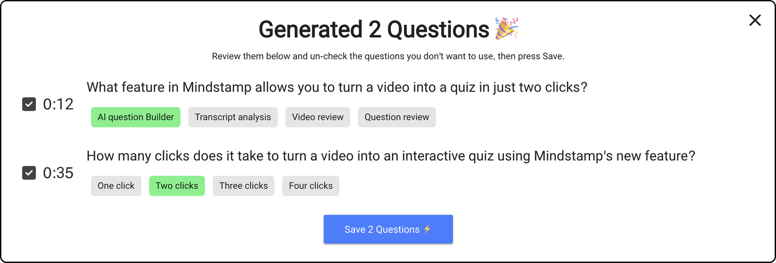 Once you’re satisfied with the questions and answers, save them to your video! The AI will recommend optimal placements for each question to ensure maximum viewer engagement and learning retention.
