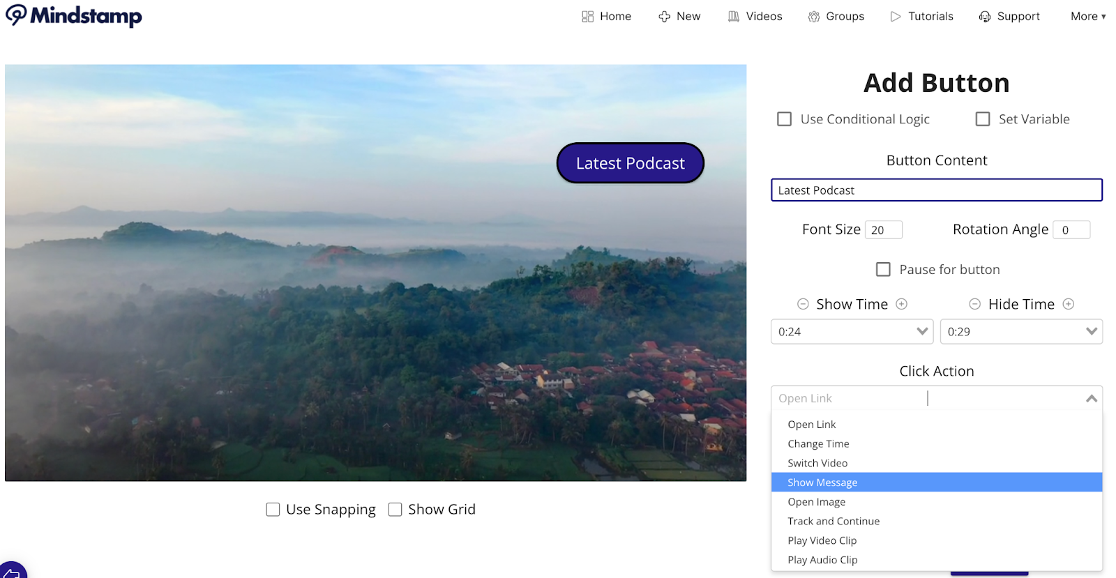 For example, you could place a button in your video that says “Click Me!” with the “Show Message” action. Once a viewer clicks on the button, a text block will appear, displaying your prewritten message on-screen.
