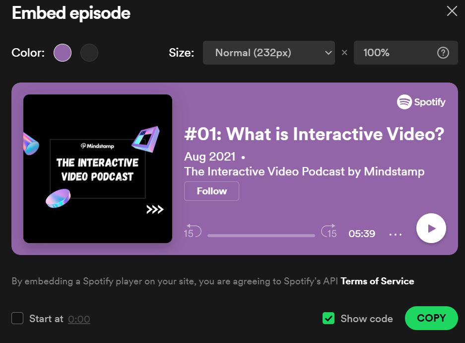 Once you’ve got a resource, simply navigate to the embed code. This is typically found under the sharing settings of the content in question. See Spotify example below: