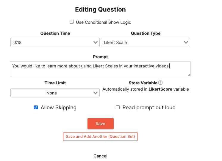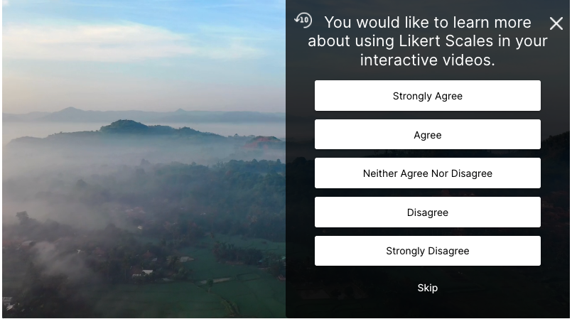 Once you have added a question in your interactive video, you can choose to show a Likert Scale question type. By providing a prompt, you can allow your views to select from Strongly Agree to Strongly Disagree. Likert Scales are common to gauge your audience’s satisfaction or agreement with a given statement. Use Likert Scales to engage with your audience by allowing them to provide feedback directly through an interactive video. Likert Scale question results are stored directly in the LikertScore variable that can be used throughout your interactive video.