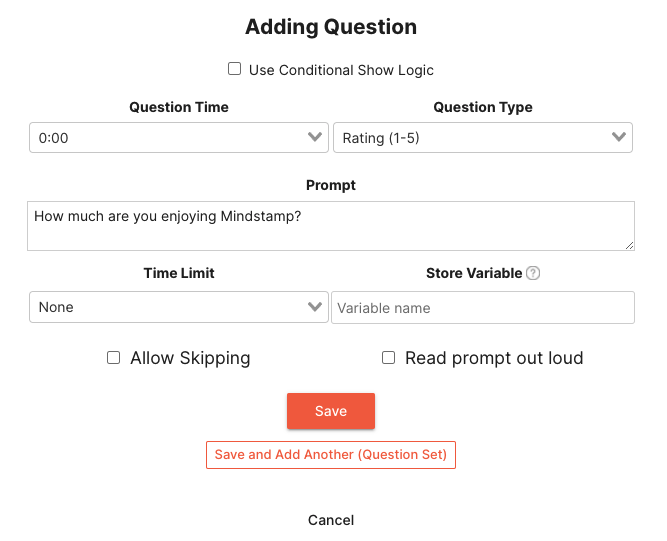 In the Mindstamp editor, once you have selected the question interaction, you can change the question type to “Rating (1-5).” From there, you can add a prompt, time limit, whether to store a variable, and other settings.