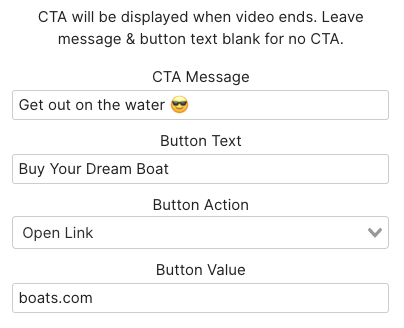 Videos without a custom CTA will continue to show the standard Replay Video prompt. You can remove the CTA entirely by leaving it blank.