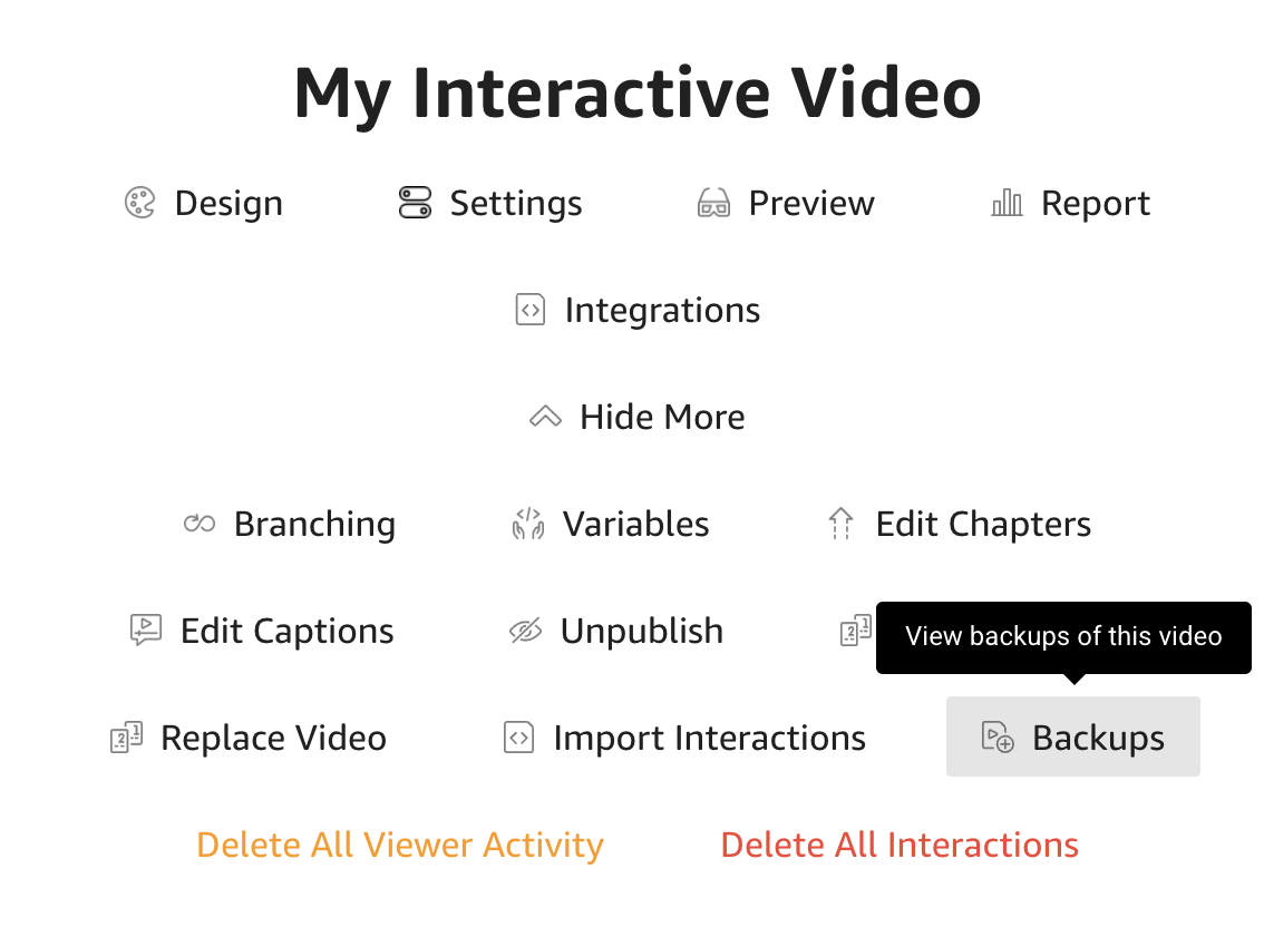 When creating a backup, the video source, top-level interactions, design, settings, integrations, design, and chapters are saved at a point in time that you can easily revert back to if you need.