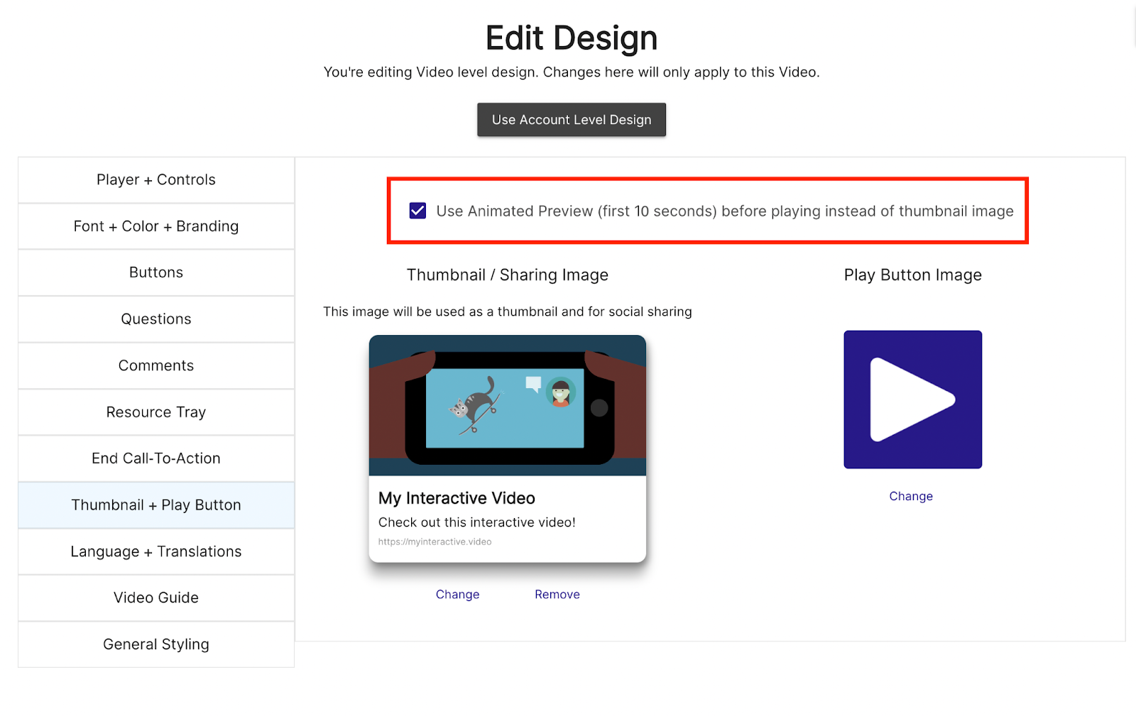 Because it's so awesome, we've made this the default for new videos created going forward. You can turn it on for your existing videos by heading to Design > Thumbnail + Play Button and check the Use Animated Preview setting. This can also be turned on via the bulk video settings page under Account!