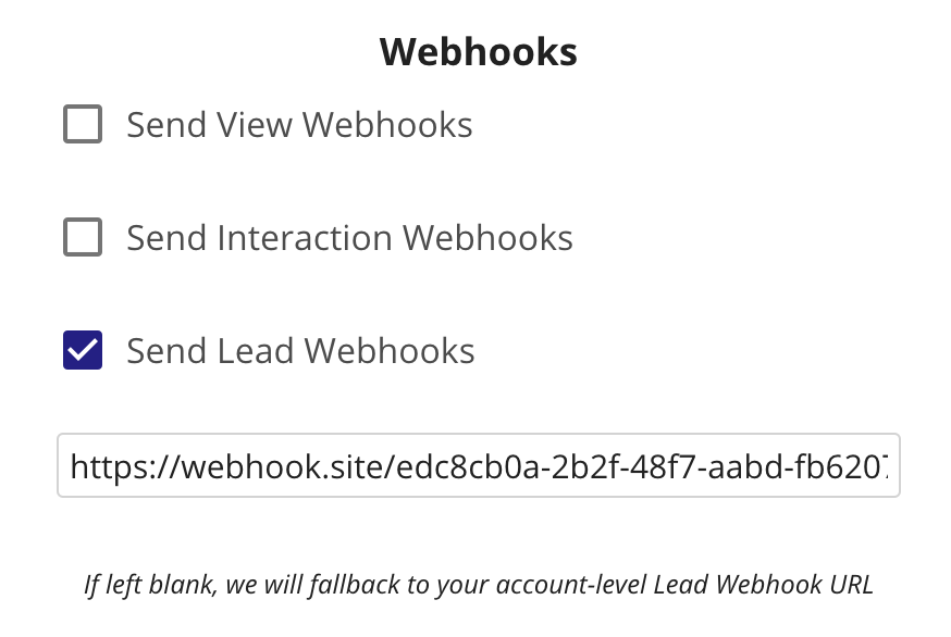 Check the Settings configuration in your video to configure which fields you want to capture, if that should be skippable and when you want to capture the information. Once the viewer finishes the video, the Lead Webhook with the content you collected can trigger.