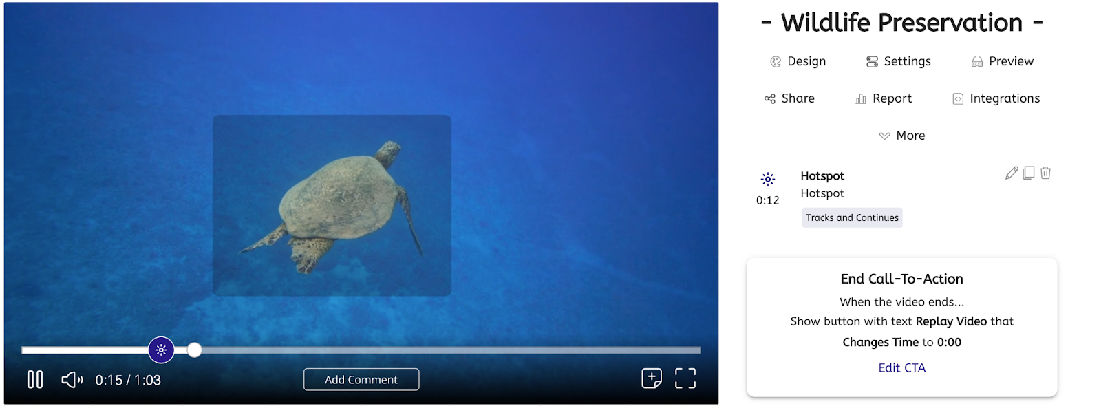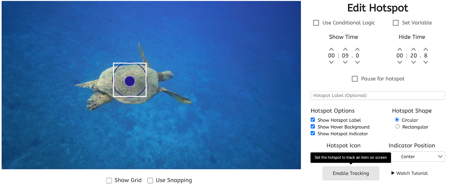 Trackable Hotspots make this critical feature even more compelling. By enabling tracking, you have the ability to set a predetermined path for your hotspot. This means that you can have it “attach” to an onscreen item and follow its movement. Or, your hotspot can move out of the way when a presenter takes the stage. Check out this shoppable example below: